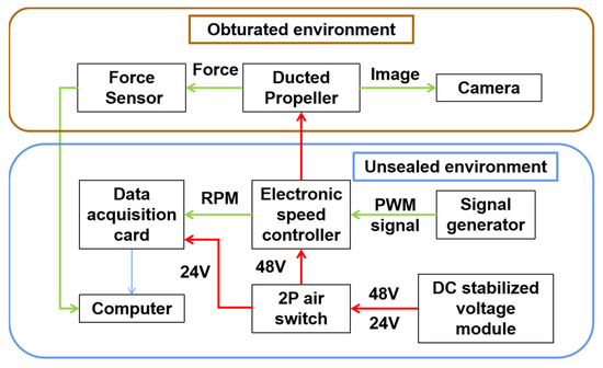 The collection of speed data from the ducted propeller was conducted through a data acquisition card that captures information pertaining to speed, voltage, and current. The speed of the propeller is directly determined by the speed of the motor, as they are directly connected to each other. The principle of acquiring speed data involves obtaining the phase-switching frequency of the electronic speed controller and using the relationship between the number of motor poles and the frequency to calculate the motor speed. In this setup, power is provided by a regulated DC power supply with adjustable voltage. The principle of propeller testing is illustrated in Figure 8.