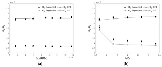 The comparison between the numerical simulation results and the test values is depicted in Figure 9. The discrepancies between the calculated thrust and power values in an unobstructed environment were found to be within a margin of 5%, while the experimental uncertainty was estimated to be approximately 3%. Similarly, the maximum error in torque calculation, when hovering over the water surface, was observed to be less than 10%, with an associated uncertainty of around 7%. Taking into account the calculation error and experimental uncertainty, the consistency between the numerical simulation results and measurement results can be considered good.