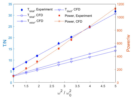 (2) The thrust and power of the ducted propeller are approximately proportional to the square of the propeller’s rotation speed. Under hovering conditions in an unobstructed environment, the duct and the propeller contribute approximately 47% and 53% of the total thrust, respectively.