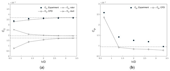 Figure 12 presents the variation curves of thrust and power for the ducted propeller in hover at a required rotation speed of 11,400 r/min at various heights above the water surface (abbreviated as heights). As depicted in the figure, the simulation results exhibit a general conformity with the experimental results. The curves exhibit the most significant variations when height is below one, with the water surface exerting the most substantial influence on the wake generated by the propeller. As the distance from the ground increases, the thrust coefficient of the propeller begins to increase, while the power coefficient of the propeller and the thrust coefficient of the duct decrease.