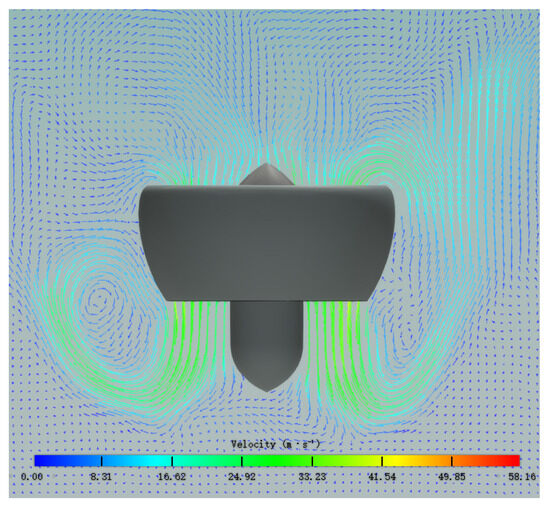 As described in the preceding section, a quantitative analysis was performed on the ducted propeller under near-surface hovering conditions using both experimental and simulation data. To investigate the mechanism of thrust loss, a numerical simulation was conducted to analyze the flow field of the propeller under identical conditions to the experimental setup. Specifically, the focus was on examining the flow conditions surrounding the propeller when hovering near the water surface.