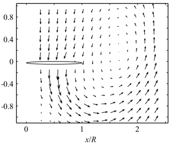 As a result of the wake emanating from the outlet of the duct and its impact on the water surface, a concave deformation of the water surface occurs below (see Figure 14). This concave deformation leads to oblique jetting of the wake, resulting in the generation of a rebound airflow upon contact with the concave region of the water surface. Figure 15 illustrates the spatial distribution of velocity vectors surrounding the propeller on the y–z plane. Upon careful observation, it becomes evident that following the impact of the propeller’s wake with the water, it undergoes a rebound toward the lateral sides of the propeller. Subsequently, the jet flow is intermittently drawn in by the propeller, resulting in the formation of a closed, ring-shaped airflow. When comparing Figure 15 [39] to the vortex ring state typically observed in PIV experimentation in the literature (Figure 16), a distinct similarity can be observed in the distribution of the velocity vector around the propeller tip. Thus, it can be inferred that the propeller is currently in a state of a vortex ring. The phenomenon known as the vortex ring state occurs when a helicopter is in a vertical descent and the induced speed of the rotor is in the opposite direction to the relative airflow. At this juncture, when the rate of descent surpasses a specific threshold, a ring-shaped vortex configuration manifests around the rotor. The vortex state of the helicopter’s rotor induces an irregular and unstable airflow in its surroundings. This condition results in the rotor consuming engine power without efficiently generating lift, which is also known as ‘settling with power’.