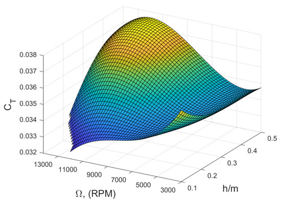The thrust prediction results obtained from the model are depicted in Figure 17 for heights ranging from 0.1 to 0.5 m and revolutions ranging from 3000 to 13,000 rpm. Based on the empirical findings, the region beyond the capability boundary of the thruster motor was eliminated to ensure that the model accurately represents the thrust under actual operating conditions. Based on the work described in this section, the near-surface thrust of the thruster could be estimated, laying the foundation for subsequent work, such as building a dynamic model of the entire CDV.