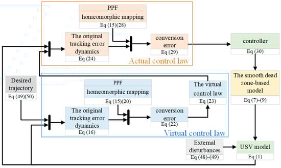The model-parameter-free control architecture is described in Section 3; however, it should be noted that and include the USV-related parameters, which are both unavailable to the designer here.