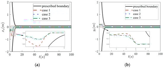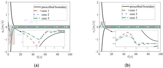 The simulation results under three cases are shown in Figure 4, Figure 5, Figure 6 and Figure 7. Figure 4 illustrates the trajectory of the USV under these three cases. The tracking errors are shown in Figure 5 and Figure 6, respectively. It can be observed from the partially enlarged detail in the figures that the tracking errors converged within the prescribed boundaries with satisfactory convergence speed. The evolution of control inputs is displayed in Figure 7. Under the same control settings, it is evident that the magnitude of the input was influenced by high-frequency and greater external disturbances. In these figures, the high-precision performance of the controller is guaranteed.