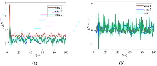 Time evolution of control inputs under three different disturbances ((a) the control force and (b) the control torque ).