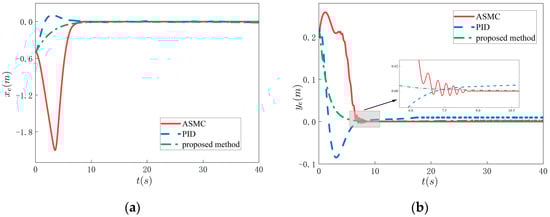 From Figure 9a,b, it is evident that the tracking errors under the influence of the three different controllers exhibited distinct characteristics. Specifically, under the proposed controller, the initial tracking errors were effectively maintained within a relatively small range. On the other hand, the remaining two controllers demonstrated comparatively large initial errors, this observation means that these controllers tend to output larger forces or torques during the initial stage of operation, which can potentially lead to more pronounced deviations from the desired trajectory.