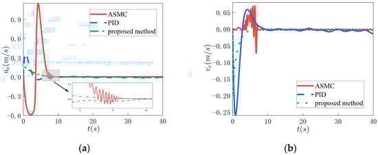 Figure 10 provides the velocity tracking errors under the influence of the three different controllers. Notably, when the proposed controller was employed, the velocity error remained relatively stable, which ensured satisfactory tracking performance. However, when the PID controller was utilized, a small amount of initial overshoot was observed during the early stages, which can impact the transient response of the system. Under the influence of the ASMC controller, a certain degree of chattering was observed as the USV approached the desired trajectory. While this chattering may introduce some deviation from the desired trajectory, it is important to note that the system still exhibited an overall robustness.