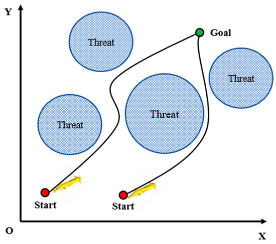 The threatening regions in the path planning model are precisely defined as circular areas. The degree of danger is directly influenced by the proximity of an AUV to the center of the circular region. The closer the AUV is to the center, the higher the level of danger it faces. Conversely, as the AUV moves further away from the center of the circular region, the level of danger decreases. To provide further clarity, the threat level of an AUV is directly related to its distance from the threat center. When the AUV’s path lies outside the threat circle, the probability of being threatened is considered to be zero. This relationship can be expressed using the following equation: