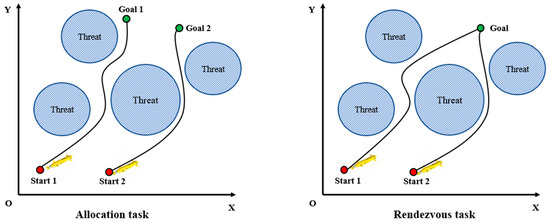 In this section, we conducted simulation experiments in two distinct scenarios, namely allocation tasks and rendezvous tasks. The allocation task aims to find the most suitable and efficient path for the AUVs, leading them from their starting positions to specific designated targets within the planning area. This task typically involves the assignment of targets to individual AUVs, aiming to minimize the overall energy consumption while ensuring coordinated arrival times. On the other hand, the rendezvous task involves determining the most suitable and viable path for each AUV and leading them from their respective starting positions to a shared target location within the planning space, as depicted in Figure 5. In this scenario, multiple AUVs must arrive at the same target location simultaneously to execute a cooperative task. The simulation experiments performed in these scenarios aimed to assess the effectiveness and efficiency of the proposed algorithm in tackling the challenges related to multi-AUV path planning.