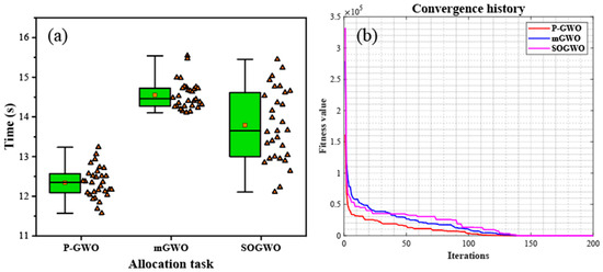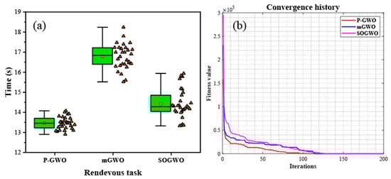 The convergence performance of each algorithm is presented in Figure 6. As depicted in Figure 6a, the proposed P-GWO algorithm exhibits superior path planning efficiency compared to existing references, with a 10–15% lower computational time, as corroborated by the statistical results in Table 1. Furthermore, the interquartile range (IQR) of P-GWO is smaller than the reference algorithms in most cases, indicating its ability to consistently produce satisfactory computational performances. The convergence data presented in Figure 6b and Table 1 demonstrate the optimality of P-GWO in solving the simulation problems, converging more rapidly to superior solutions than the other reference algorithms. The use of an adaptive decay factor and clustering strategy significantly contributes to the superior performance of the proposed P-GWO algorithm.