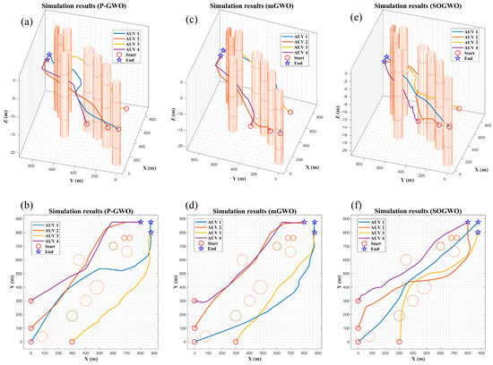 The experimental outcomes are visually represented in Figure 7, showing both the 2D and 3D path planning results. The presented results demonstrate the efficiency of the proposed algorithm in generating a feasible path for multi-AUVs adhering to the imposed spatial constraints. Notably, the comparative analysis of the P-GWO approach against the mGWO and SOGWO algorithms reveals its superiority in generating safer trajectories with fewer segments intersecting the designated danger zone.