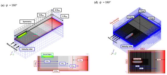Three grid systems were used to evaluate the added resistance in oblique waves. First, in calm water and head sea () conditions, calculations were performed using a captive model and soft-mooring system in half-breadth conditions, as shown in Figure 2a. The distance from the hull to the inflow boundary was 0.5, which is intended to minimize wave dissipation. A length of 3.5 was applied, including the grid damping area in the downstream area of the hull to prevent wave reflection. The length to the side and bottom boundary was 1.5, and the length to the top was 1.