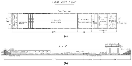 (a) Plan view of large wave-flume dimensions and sand slope definition and (b) cross-section A–A’, dimensions in cm.