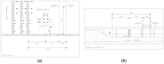(a) Plan view and (b) cross-section of the placement of the structure and wave sensors based on the sloping part of the beach profile.