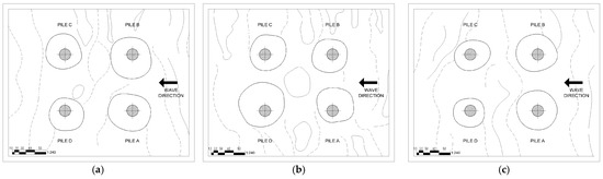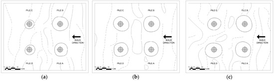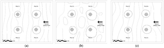 Scour extensions for tests: (a) E01, with ICC = 0.00 m and T = 9.04 s; (b) E02, with ICC = 0.00 m and T = 12.16 s; and (c) E03, with ICC = 0.00 m and T = 15.57 s.