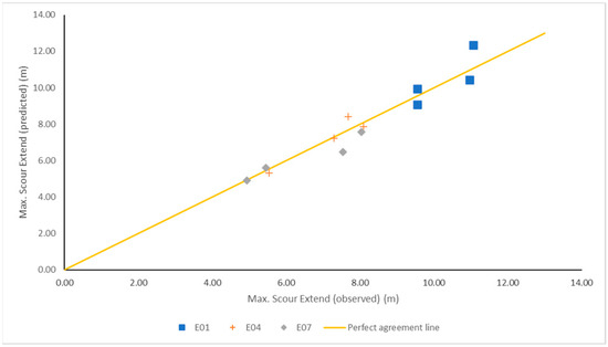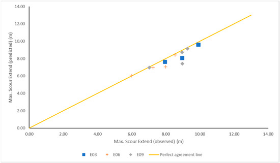 Maximum scour extensions observed vs. maximum scour extensions predicted for tests E03, E06, and E09, with T = 15.57 s. R2 = 0.848.