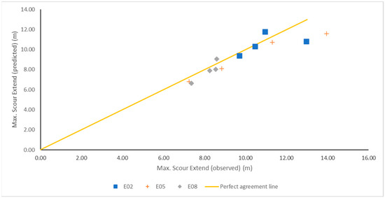 Maximum scour extensions observed vs. maximum scour extensions predicted for tests E02, E05, and E08, with T = 12.16 s. R2 = 0.821.