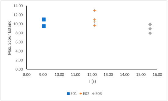 Scour extension for tests: (a) E01, with ICC = 2.00 m and T = 9.04 s; (b) E02, with ICC = 2.00 m and T = 12.16 s; and (c) E03, with ICC = 2.00 m and T = 15.57 s.