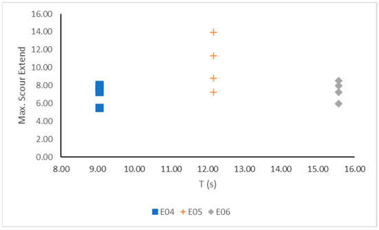 Maximum scour extensions for tests E04, E05, and E06, ICC = 2.00.