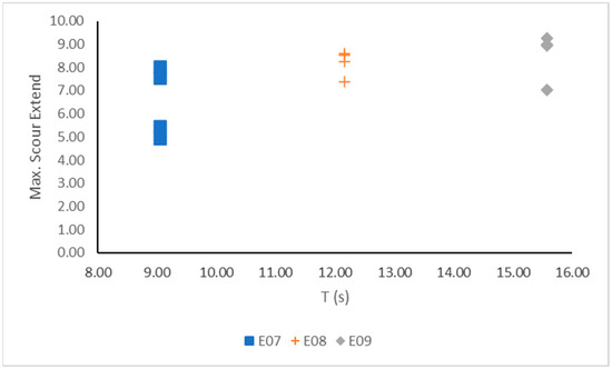 Maximum scour extensions for tests E07, E08, and E09, ICC = 4.00.