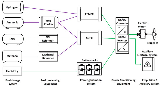 As shown in Figure 3, there are five categories: fuel storage system, fuel processing equipment, power generation system, power conditioning equipment, and propulsion/auxiliary system. For the power generation system, three different technologies are considered (proton exchange membrane fuel cell (PEMFC), solid oxide fuel cell (SOFC), and battery system), while looking at the fuel storage system onboard, the following fuels are considered: hydrogen, ammonia, LNG, and MeOH, with related fuel processing equipment. The power conditioning equipment is composed of a DC/DC converter, and a DC/AC inverter, while the fuel-processing equipment is based on the fuel type and consists of an ammonia cracker, natural gas reformer, and MeOH reformer. Regarding the propulsion system, the electric motor is selected to exist in all the proposed cases to deliver the required power to the FPP.