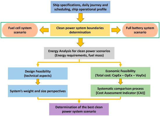 The paper presents a multi-aspect analysis to determine the most feasible clean power system to be implemented onboard the case study according to different aspects: ferry daily journey and scheduling, available volumes and spaces, propulsion power needs, energy storage/fuel tank capacity needed, economics, etc. Different types of clean power systems (batteries, PEMFC, and SOFC) are proposed to be investigated to assess and evaluate their effectiveness onboard from an economic and design perspective. Therefore, this target can be investigated and accomplished by using the following methodology as shown in Figure 4.