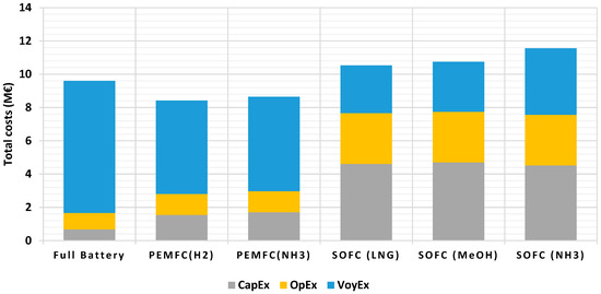 where is the annual VoyEx in EUR/year, is the energy carrier/fuel consumption measured in kWh, and is the cost of the energy carrier measured in EUR/kWh. The cost of hydrogen, ammonia, LNG, and methanol based on the recent prices are 100, 81, 58, and 61 EUR/MWh, respectively [56,70,71], while the electricity cost is assumed to be 226 EUR/MWh based on the average price in the last five years in Italy [72]. Due to the lack of information available regarding the bunkering operation fees of alternative fuels, these fees have been neglected in the current study.
