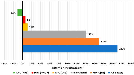 As shown in Equation (12), the ROI is based on the difference between the operational and voyage expenses of each clean power system and the diesel-powered system (DP). The annual operational costs of diesel power systems are assumed to be 5 EUR/kW (2% of CapEx per year) as reported in [62], while its VoyEx is based on the recent price of diesel fuel (1.85 EUR/Liter) in Genoa refueling stations [74].