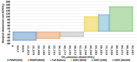 Moreover, MAC is a crucial indicator in the economic and environmental assessment, specifically in the case of evaluating the financial rationale for pursuing and investing in a clean power system [75,76]. The MAC is defined as the ratio between the costs or savings that would be incurred from the retrofitting process of the vessel’s power system and the abated emissions over the lifetime of the ship that could guarantee a zero-emission journey to the ferry [77]. This indicator can be calculated for each power system by considering the total capital costs and the annual costs/savings discounted over the lifetime of the clean power system. The total capital costs and the annual costs discounted to the present value are expressed as NPV which can be calculated by using Equation (10). For the case study of retrofitting process, the savings result from the removed OpEx and VoyEx of the diesel-powered system discounted to the present value. In this study, the formula shown in Equation (13) can be used to calculate the MAC [78].