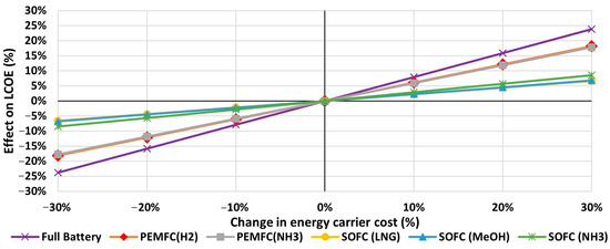 Similarly, the operational expenses of the FC system include maintenance costs and replacement costs. The annual maintenance cost of PEMFC and SOFC is assumed to be 2% of their CapEx [62]. The crucial parameter in the FC power system’s OpEx is the replacement cost as it is dependent on the FC lifetime and the forecasted number of replacements over the ship’s lifetime. Based on the literature review [56,68], the lifetime of FCs is approximately 20,000 h and their stacks must be replaced after implementing these operational hours, while the Balance-of-Plant (BoP) system of FC racks demonstrates a prolonged lifespan compared to its stack; therefore, only the replacement of FC stacks will be considered. As a result of the forecasted development in the market size of FCs in the transportation sector, the FC prices may be reduced to about half of today’s price [64]. Hence, the replacement cost of FC stacks is set to be 50% of its CapEx [64]. The number of replacements of the FC power system () can be calculated as shown in Equation (8).