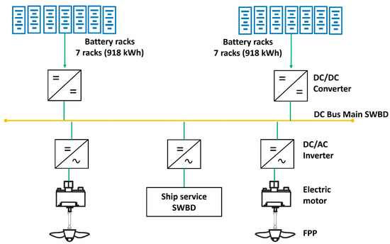 Since the battery lifetime can be given and expressed as the number of battery cycles, the batteries are replaced several times based on the ship’s lifetime and the number of trips per year. The number of replacements () can be calculated as shown in Equation (5).