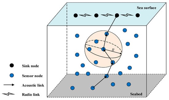 This paper considers a network architecture that includes multiple sink nodes [], as depicted in Figure 2. The utilization of this architecture simplifies the practical deployment of the UASN. The network comprises a collection of sensor nodes, denoted as , and sink nodes, denoted as . The maximum transmission range of the sensor nodes is . Thus, the network can be represented .