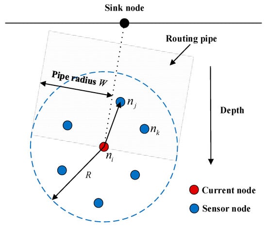 In our selection process for the candidate forwarding set from the neighboring nodes, we take into account both the node depth and the pipe radius of the routing vector, ensuring a comprehensive consideration of these factors. The set of sensor nodes in the UASN is defined as , where is the number of sensor nodes.