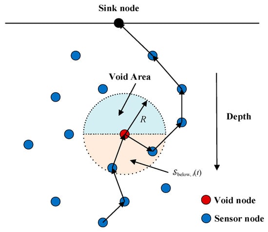 Over the past decade, many routing protocols specifically tailored for the UASN have been proposed [,,]. Traditional routing protocols, which are typically based on a fixed routing table or static network topology, are not suitable for the UASN due to the dynamic nature of the underwater environment and the limitations of underwater acoustic signal transmission. The use of traditional routing protocols in the UASN can result in significant propagation latency, data transmission rate limitations, and increased energy consumption by underwater sensor nodes. These limitations bring about the routing void, long packet delay, and data packet loss, which can significantly degrade the network performance. Typically, two categories of conventional routing protocols exist in the UASN, namely the location-aware routing protocol and the depth-aware routing protocol.
