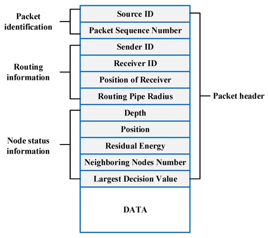 Deploying the UASN poses challenges due to the demanding environmental conditions and substantial deployment costs. First, the sound signal propagates much more slowly in the water, at approximately 1500 m/s, leading to noticeable latency in signal propagation. Second, some factors, such as water absorption, scattering, and underwater noise interference, limit the data transmission rate of the underwater acoustic signal. Third, the complexity and uncertainty of the underwater environment further increase the difficulty of underwater acoustic communication. Hence, underwater sensor nodes consume much more energy than their terrestrial counterparts when transmitting data of the same size []. In order to optimize energy utilization and enhance data transmission efficiency in the UASN, the design of an appropriate routing protocol is of paramount importance. This routing protocol should possess the flexibility to adapt to the dynamic underwater environment.