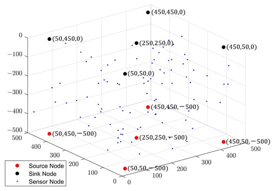 In the UASN, each sensor node in the network has a unique ID and limited energy. Moreover, it has the knowledge about the locations of sink nodes, the sender (via the packet header), one-hop neighboring nodes, and its own location through underwater localization algorithms []. The sensor nodes are uniformly distributed within a 3D area measuring 500 m × 500 m × 500 m. The sensor nodes only receive information from one-hop neighboring nodes. The sink nodes, which have unlimited energy and the ability to communicate using RF and acoustical modes, are fixed on the water surface. The source nodes, which have the ability to move horizontally, are deployed at the bottom. The locations of sensor nodes are illustrated in Figure 7. The parameters in the simulations are listed in Table 2.