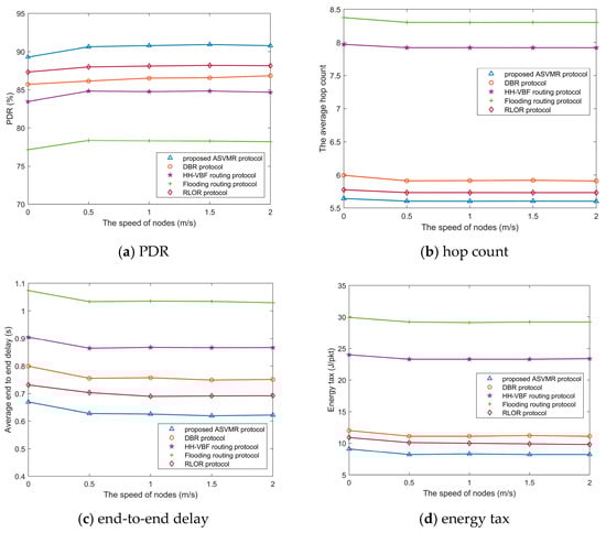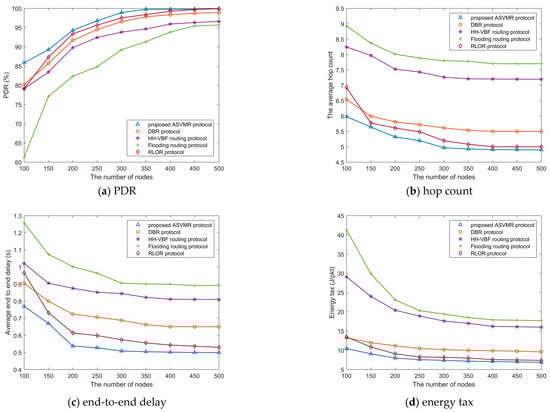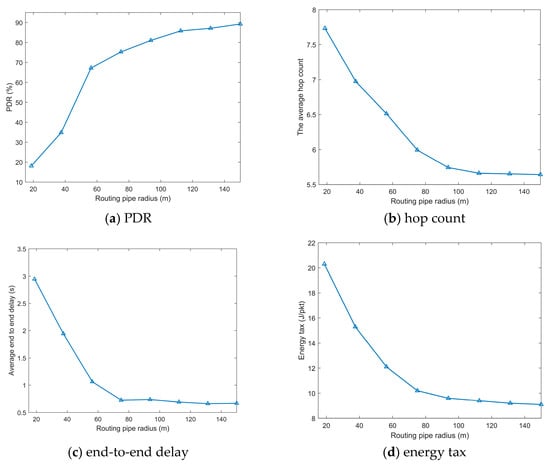 Therefore, the routing pipe radius affects the performance of the ASVMR protocol significantly. The increase in the routing pipe radius results in a higher PDR, smaller hop count, and lower end-to-end delay and energy tax in the ASVMR protocol, which indicates that a more optimal path is selected.