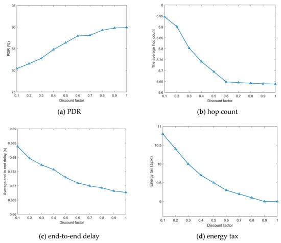 From Figure 10, we observe that the magnitude of the discount factor has a certain effect on the performance of the ASVMR protocol. As the value of the discount factor increases, the PDR increases, while the hop count, the end-to-end delay, and the energy consumption decrease.