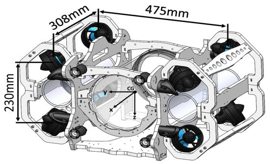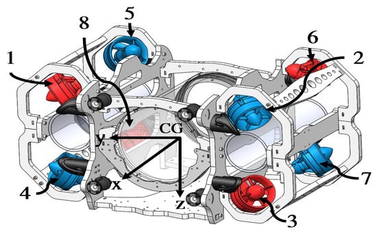 The eight vehicle’s thrusters are model T200 of BlueRobotics and these are placed at the vertices of the structure (assuming that the vehicle has a rectangular prismatic geometric shape) with an inclination of in each of the 3 axes. With this configuration we obtain a greater thrust in each direction, which allows to compensate small disturbances. The distribution of the thrusters is shown in Figure 4, where the propeller of thrusters in red color turn in clockwise direction (CW) and the propeller of thrusters in blue color turn in counter-clockwise direction (CCW). Through the combination of thrusters, the vehicle can generate lateral, vertical, longitudinal displacements, as well as rotational movements in roll, pitch and yaw angles. The vehicle axes are given in the body frame as , , .