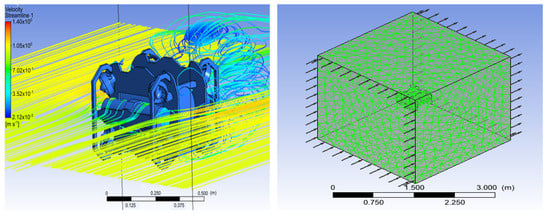 The designed vehicle, like any other body immersed in a moving fluid, is subject to forces due to the fluid. For the design process, we consider the effects of drag and lift. Drag is defined as the force opposed to movement through the fluid, this drag coefficient was obtained by numerical analysis using the ANSYS Fluid Flow (CFX) software version 20.2. The process was carried out using a control cubic volume Figure 3 (right), the considerations used correspond to a fluid velocity of 1029 ms, at an ambient temperature of 22 °C and a density of 997.86 kg/m3, a simplified vehicle geometry is used which is virtually introduced in the control volume. In the control geometry, the front and rear parallel faces to the analysis plane are considered as input and output respectively. To obtain the values in the translation axis x, y and z, the planes as well as the faces of the control volume are alternated. The approximate drag forces obtained are , and , and the approximate drag coefficients are , and . In Figure 3 the velocity profile of the fluid is observed acting on the surface of the vehicle in the axis of translation y.
