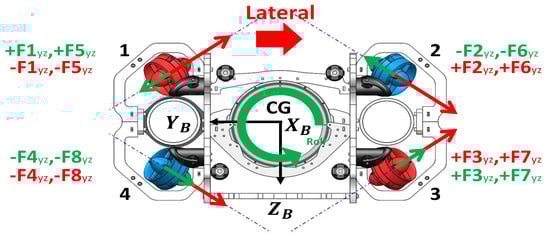 - Lateral movement. This is produced by applying a positive signal to thrusters (2, 3, 6, 7) and a negative signal to thrusters (1, 4, 5, 8).