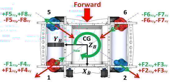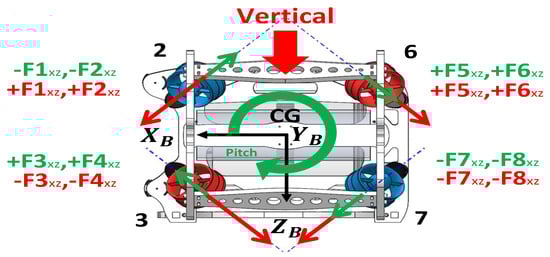 Similarly, Figure 6 shows the lateral view of the vehicle, the thrusters distribution and the forces generated on the left side of the vehicle. From this view, the vehicle can perform the following movements:
