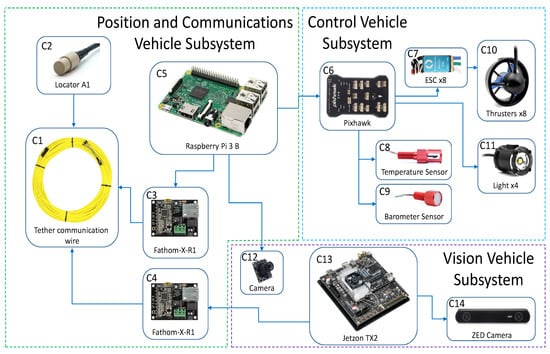 The internal electrical system of the underwater vehicle, which is divided into three subsystems. The first one, the position and communication subsystem, which allows the communication of the vehicle’s embedded computers with the control ground station through the MavLink protocol. The second one corresponds to the control subsystem, which is composed by an autopilot, sensors and thrusters. The latter one, the vision subsystem, which is integrated by a low light monocular camera, a stereo vision camera and an image processing system. The vehicle operates with two lipo batteries of 4 cells (4 s) 10 ah connected in parallel. The components of the electrical and electronics system are labeled from C1 to C14 in Figure 8.