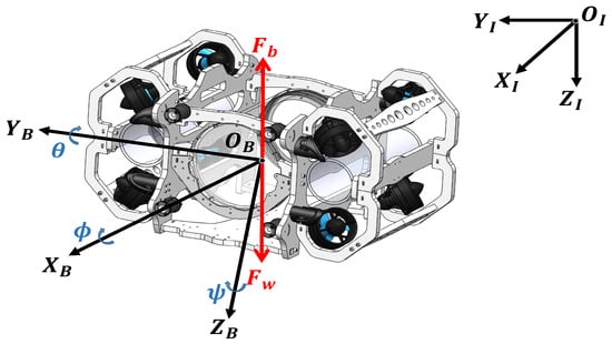 Consider the underwater vehicle presented in Figure 9. Let us define the inertial and body frame as and , respectively, describes the vehicle’s position and orientation in the inertial frame, denotes the linear and angular velocities in the body frame.