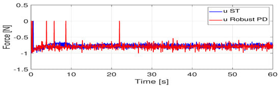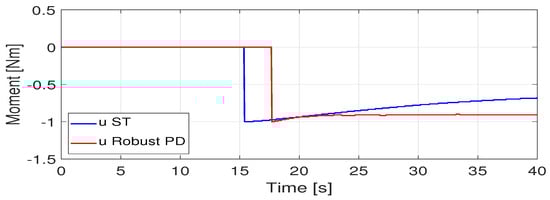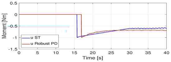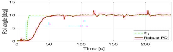 In Figure 25 we can see the robustness behavior of the Robust PD controller. In this test, the vehicle was stabilized at a reference of 10 degrees on , during the test time, a load of 200 g was applied and removed at the edge of the vehicle, generating a disturbance of approximately 1.5 degrees in roll angle. The moment opposing to the control signal is , the negative peaks indicate when the load was placed while positive peaks indicate when the load was removed.