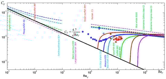 where V is the volume (displacement), is speed, X is the total drag, and and are the density and kinematic viscosity of water, respectively. These values of (shown in Figure 1 by the black solid line) are smaller than the drag on some special-shaped bodies of revolution [,,] (see markers in Figure 1).