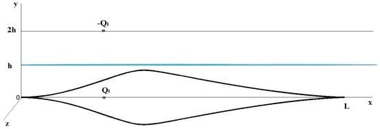 The wave drag caused by the hulls with a sharp concave nose (similar to the rostrum of the fastest fish [,,,] and shown in Figure 3) can be estimated with the use of the vertical velocities on the water surface. In order to simulate the presence of the water boundary, let us use sources and sinks with intensities Qi located on the axis of symmetry Ox and sources and sinks of opposite intensities −Qi located on the line y = 2h, z = 0 (see Figure 3 []). Then, the vertical velocities on the water surface at the plane of symmetry (y = h, z = 0) can be estimated as follows []: