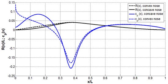 and a set of constant parameters a, b, , and x* are chosen in order to calculate an example of a body of the same L/D ratio with a convex nose (see the black dashed line in Figure 3), whereby the pressure coefficient on its surface in unbounded flow (is shown by the blue dashed line in Figure 3) and Formula (8) are used for corresponding values of (see dashed lines in Figure 5).