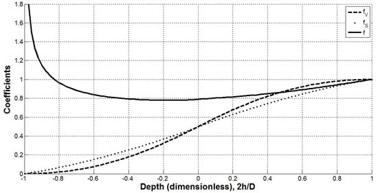 Shape coefficients fS, fV and the friction drag coefficient f versus dimensionless depth for the axisymmetric body similar to the shape of sailfish (shown in Figure 3 by the solid black line).